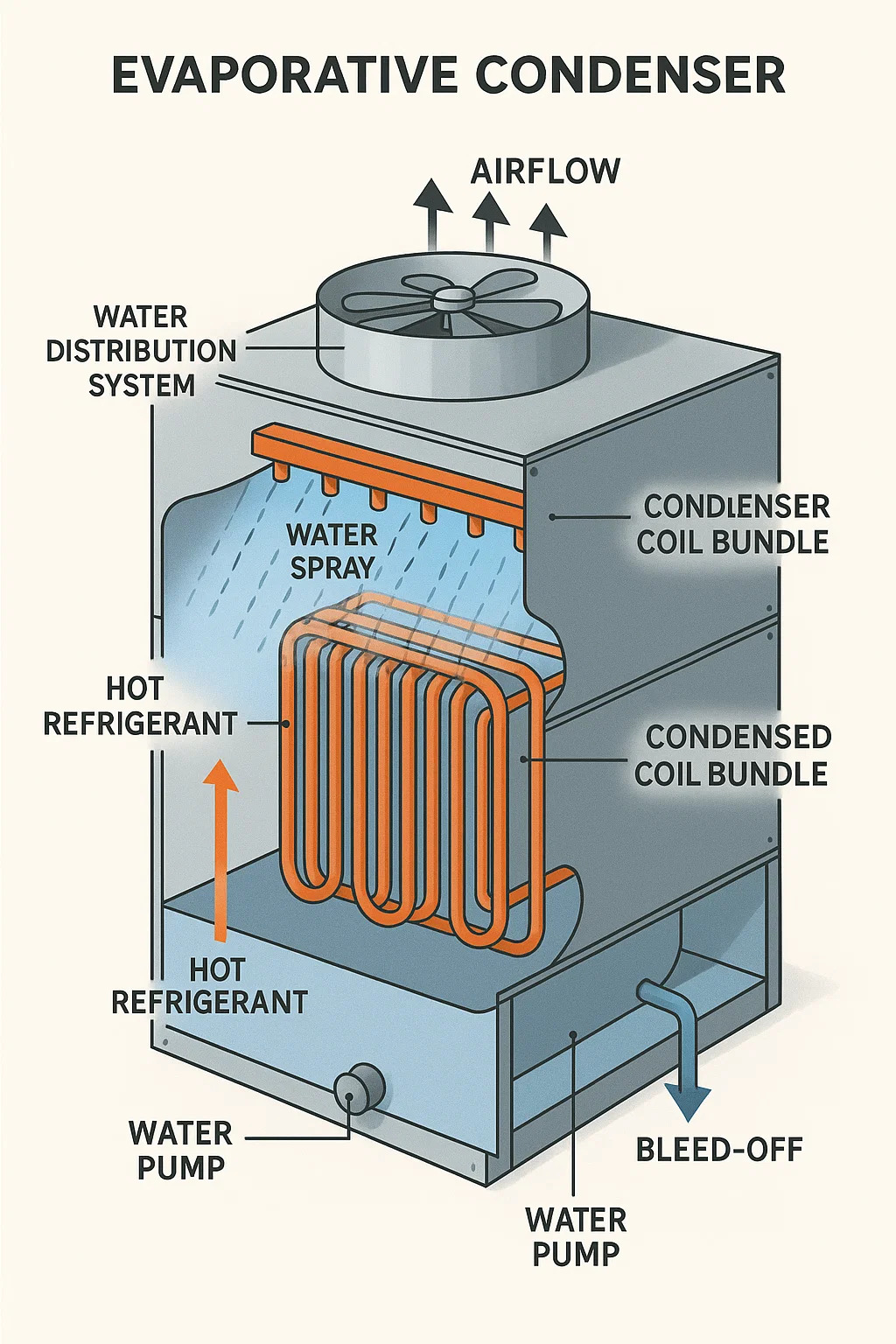 アン 蒸発凝縮器 空冷と水の蒸発を統合して、冷凍システムからの熱を排除します。その設計と動作は標準の空冷コンデンサーとは根本的に異なります。